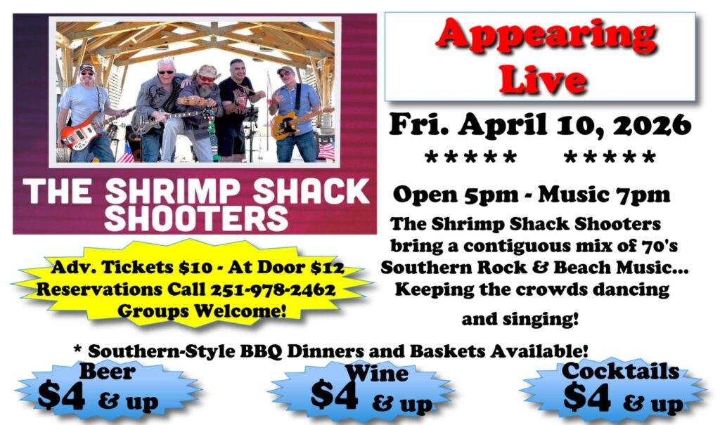 We are in full swing each Fri., & Sat. with “The Favorites Band” and all your favorite songs for dancing and listening…plus, the Best Southern BBQ in the South! Call 251-978-2462 for discount tickets and info!