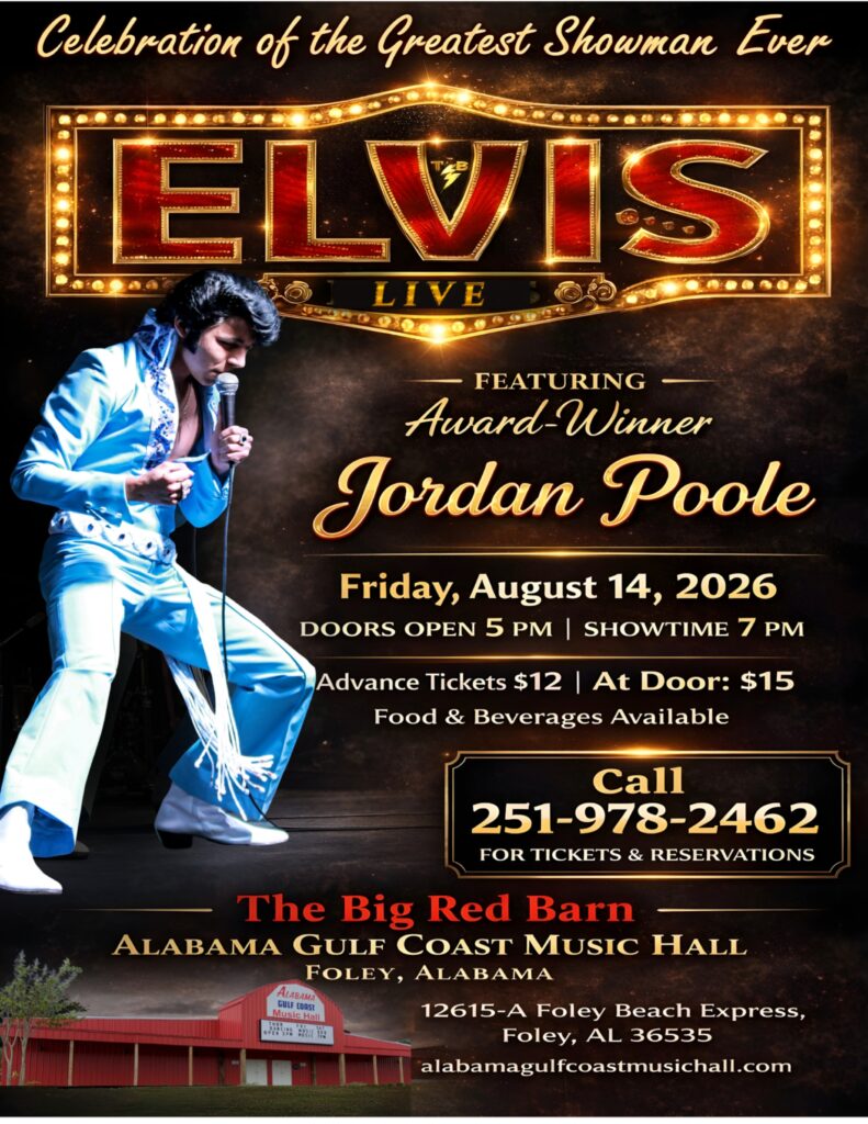 Another great week of great things to do and enjoy at ALALBAMA GULF COAST MUSIC HALL (THE BIG RED BARN) on the Foley Beach Express in Foley, Alabama…Here is this weeks schedule…