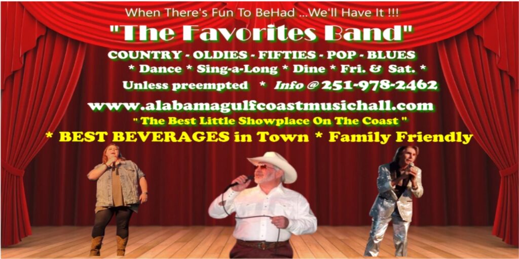 We are in full swing each Fri., & Sat. with “The Favorites Band” with special guests and all your favorite songs for dancing and listening…plus, the Best Southern Burgers and Dogs in the South … And all your favorite beverages – Call 251-978-2462 for discount tickets – reservations and info!